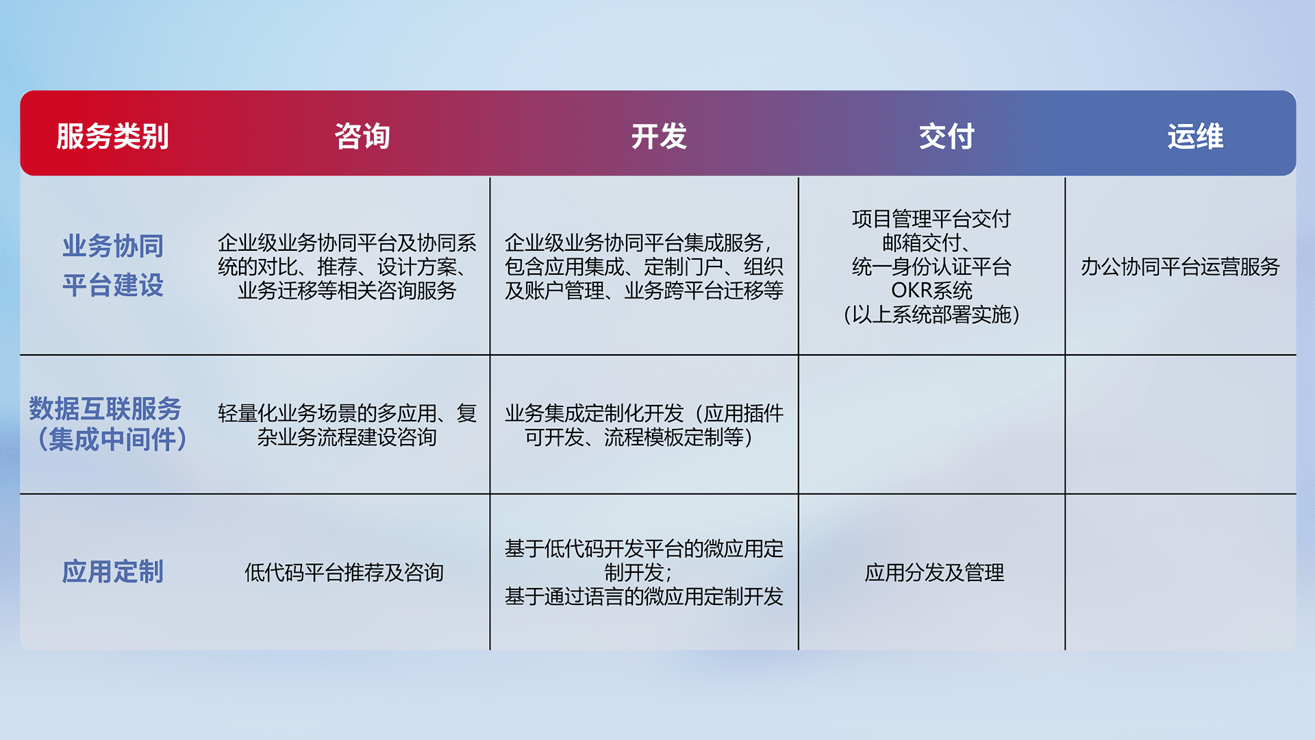 针对钉钉、、、企微、、、、IDaas等平台级产品提供产品的规划、、、方案、、、交付、、定制化开发等服务,,实现如统一协同办公、、、智能客户服务、、、混合会议管理、、、智能数据查询、、、等业务场景,,实现数字化转型。。。。
