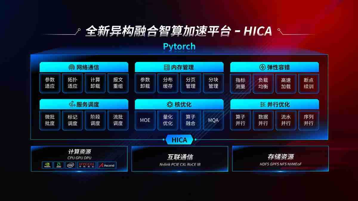 通过自研的服务层、、中间适配层、、以及调度编排算法,,,采用数据并行、、、模型并行等多种并行方式,,,,把并行计算任务进行有效的分解,,,使其分别由相应的软件栈和算力资源来承接。。。。当GPU资源变化,,,HICA可以实时动态调度计算子任务并调整模型拓扑和架构,,以充分聚合各种算力资源。。。。